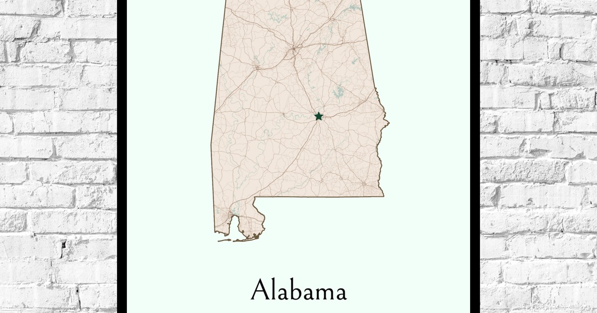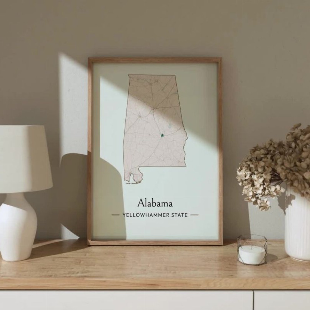 Our Alabama State Poster - Boundary Map is available in the always ideal Portrait orientation, or it can be fully customized to your liking. Perfect for any space, this work comes in various size options and finishing materials. In fact, your Alabama State Poster - Boundary Map will have a classic, gallery-quality look when you choose from Matte Poster, Metal Frame, Canvas, Wood Print, and more. Don't hesitate! Give your walls the makeover they deserve!