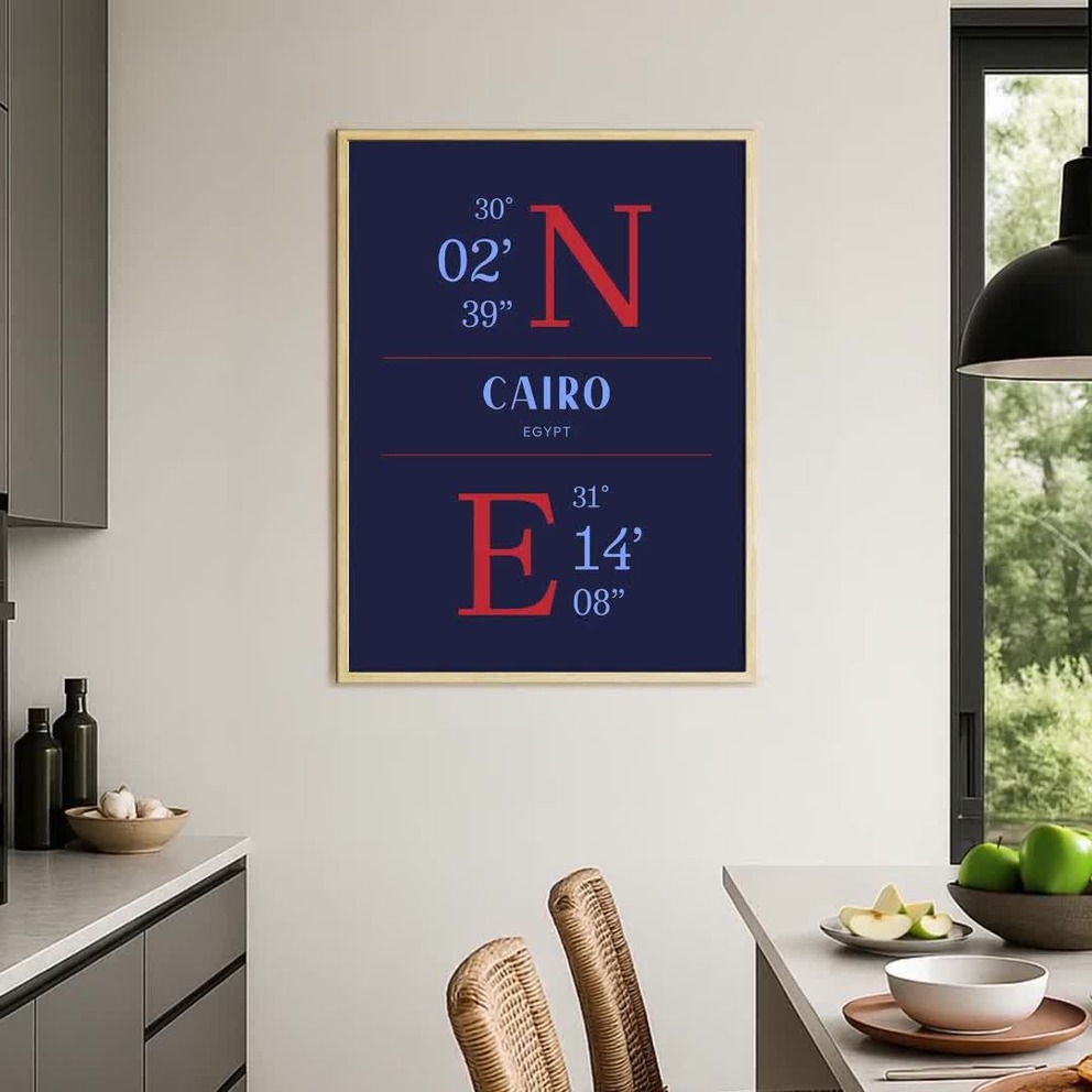 Our Cairo Coordinates Poster is available in the always ideal Portrait orientation, or it can be fully customized to your liking. Perfect for any space, this work comes in various size options and finishing materials. In fact, your Cairo Coordinates Poster will have a classic, gallery-quality look when you choose from Matte Poster, Metal Frame, Canvas, Wood Print, and more. Don't hesitate! Give your walls the makeover they deserve!
