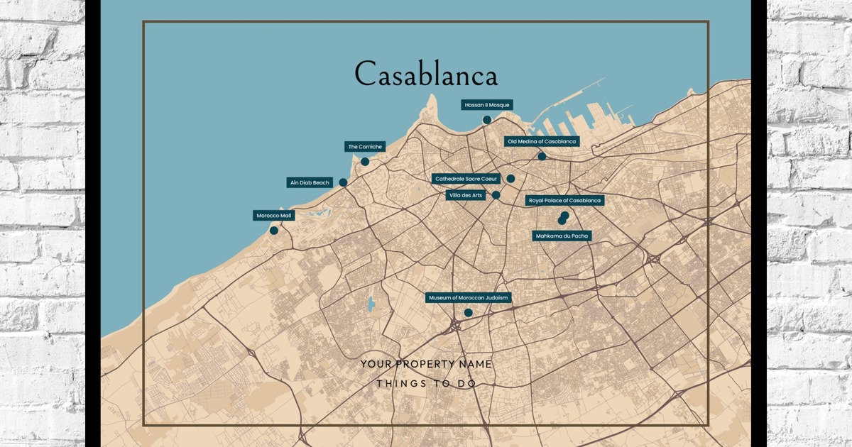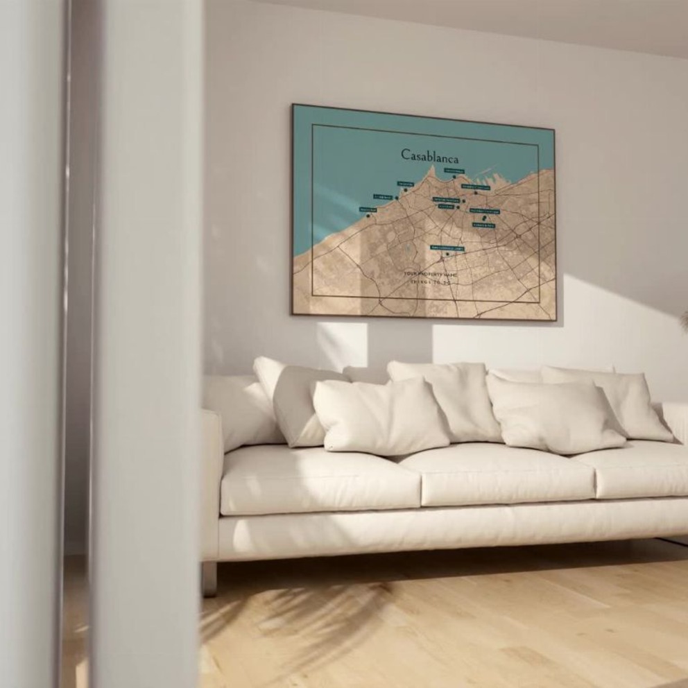 Our Casablanca Airbnb Tourist Poster in Road Trip - Street Map is available in the always ideal Landscape orientation, or it can be fully customized to your liking. Perfect for any space, this work comes in various size options and finishing materials. In fact, your Casablanca Airbnb Tourist Poster in Road Trip - Street Map will have a classic, gallery-quality look when you choose from Matte Poster, Metal Frame, Canvas, Wood Print, and more. Don't hesitate! Give your walls the makeover they deserve!