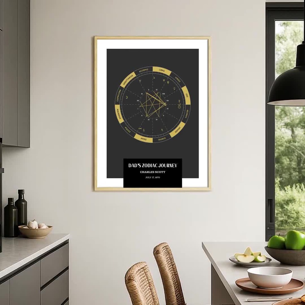 Our Dad’s Zodiac Journey Poster - Dark Gold- Natal Chart is available in the always ideal Portrait orientation, or it can be fully customized to your liking. Perfect for any space, this work comes in various size options and finishing materials. In fact, your Dad’s Zodiac Journey Poster - Dark Gold- Natal Chart will have a classic, gallery-quality look when you choose from Matte Poster, Metal Frame, Canvas, Wood Print, and more. Don't hesitate! Give your walls the makeover they deserve!
