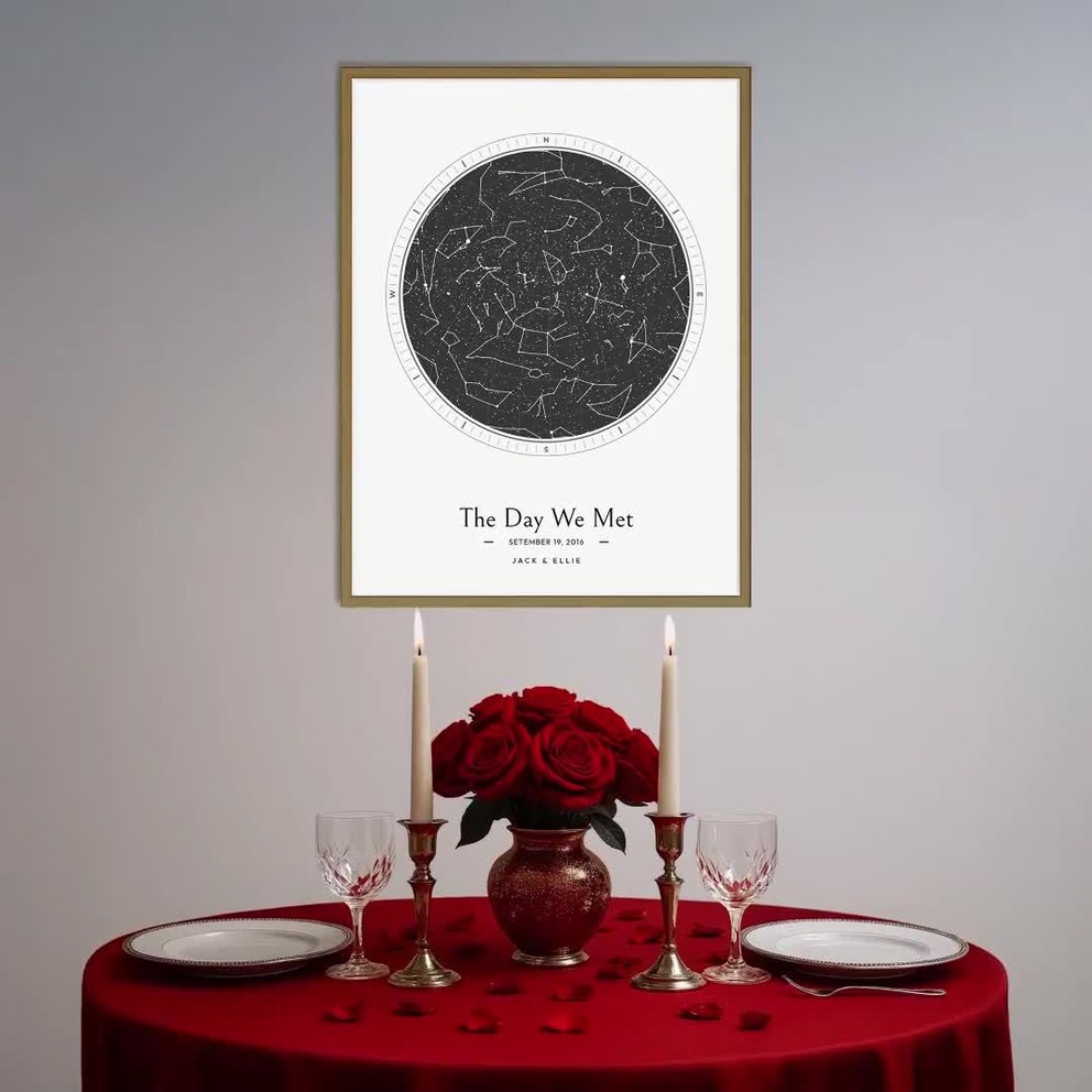 Our The Day We Met Poster - Celestial Map is available in the always ideal Portrait orientation, or it can be fully customized to your liking. Perfect for any space, this work comes in various size options and finishing materials. In fact, your The Day We Met Poster - Celestial Map will have a classic, gallery-quality look when you choose from Matte Poster, Metal Frame, Canvas, Wood Print, and more. Don't hesitate! Give your walls the makeover they deserve!