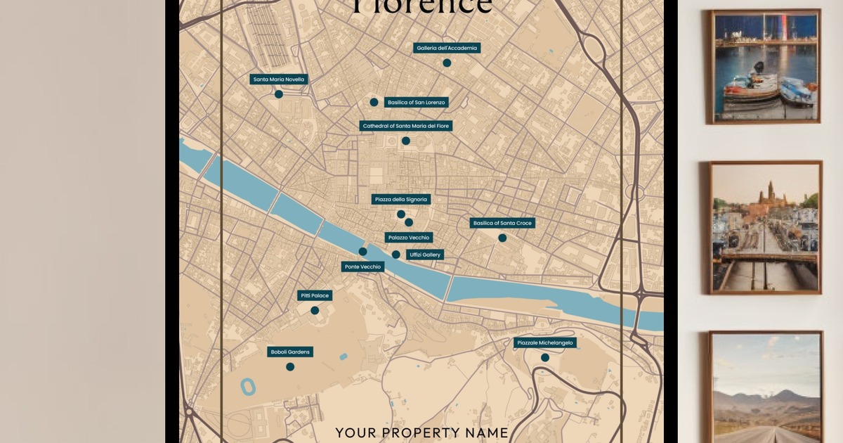 Our Florence Airbnb Tourist Poster in Road Trip - Street Map is available in the always ideal Portrait orientation, or it can be fully customized to your liking. Perfect for any space, this work comes in various size options and finishing materials. In fact, your Florence Airbnb Tourist Poster in Road Trip - Street Map will have a classic, gallery-quality look when you choose from Matte Poster, Metal Frame, Canvas, Wood Print, and more. Don't hesitate! Give your walls the makeover they deserve!