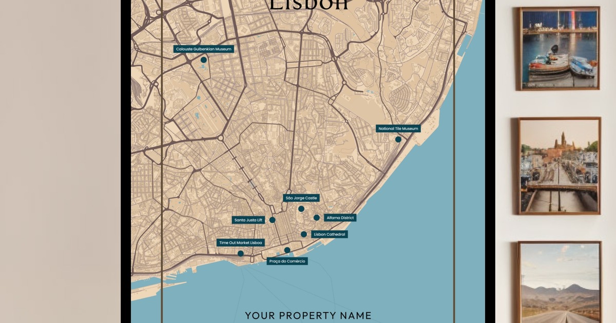 Our Lisbon Airbnb Tourist Poster in Road Trip - Street Map is available in the always ideal Portrait orientation, or it can be fully customized to your liking. Perfect for any space, this work comes in various size options and finishing materials. In fact, your Lisbon Airbnb Tourist Poster in Road Trip - Street Map will have a classic, gallery-quality look when you choose from Matte Poster, Metal Frame, Canvas, Wood Print, and more. Don't hesitate! Give your walls the makeover they deserve!
