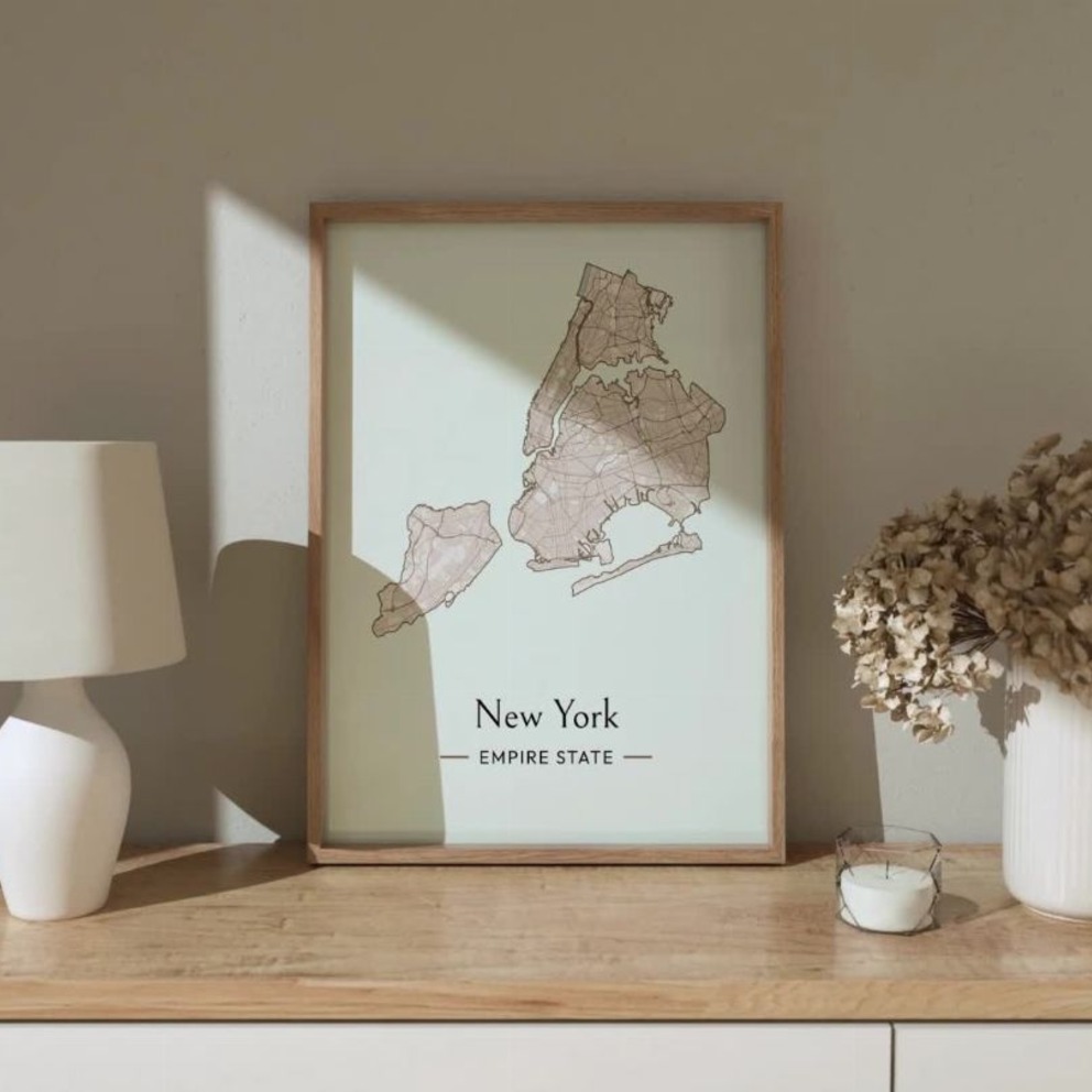 Our New York State Poster - Boundary Map is available in the always ideal Portrait orientation, or it can be fully customized to your liking. Perfect for any space, this work comes in various size options and finishing materials. In fact, your New York State Poster - Boundary Map will have a classic, gallery-quality look when you choose from Matte Poster, Metal Frame, Canvas, Wood Print, and more. Don't hesitate! Give your walls the makeover they deserve!