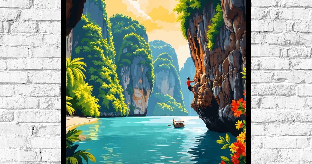 Rock Climbing in Railay Travel Print - Vintage Travel Art Poster