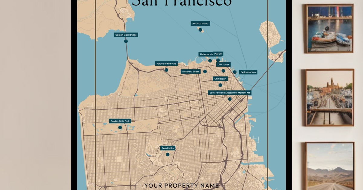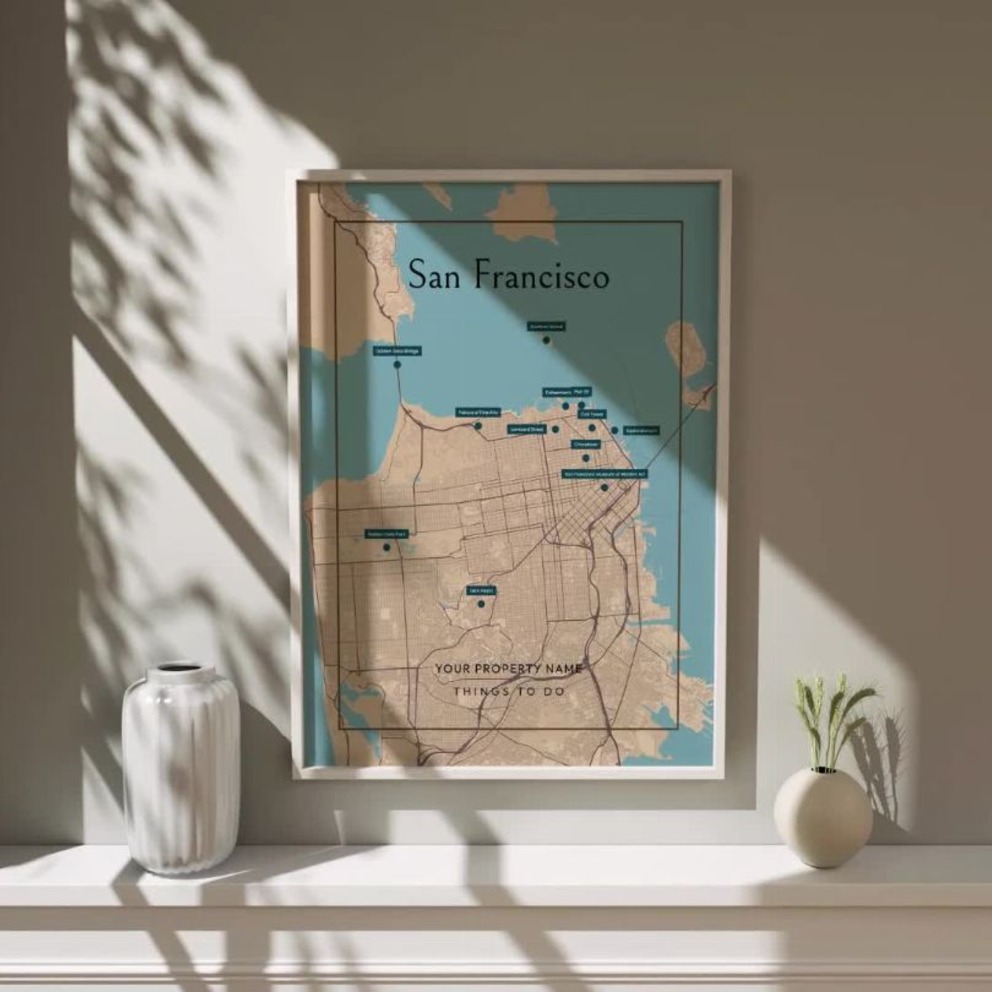 Our San Francisco Airbnb Tourist Poster in Road Trip - Street Map is available in the always ideal Portrait orientation, or it can be fully customized to your liking. Perfect for any space, this work comes in various size options and finishing materials. In fact, your San Francisco Airbnb Tourist Poster in Road Trip - Street Map will have a classic, gallery-quality look when you choose from Matte Poster, Metal Frame, Canvas, Wood Print, and more. Don't hesitate! Give your walls the makeover they deserve!